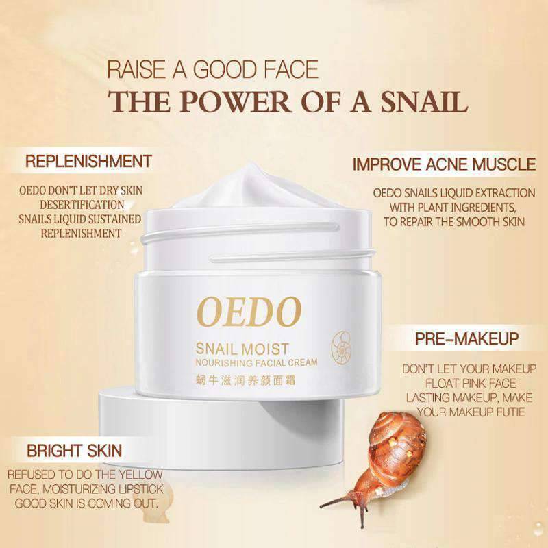 OEDO Anti Wrinkle Anti Aging Snail Moist Nourishing Facial Cream contains snail mucus. This whitening face cream has chemical composition of snail mucus secretion has the firming effect, which can make the skin rapid regeneration.